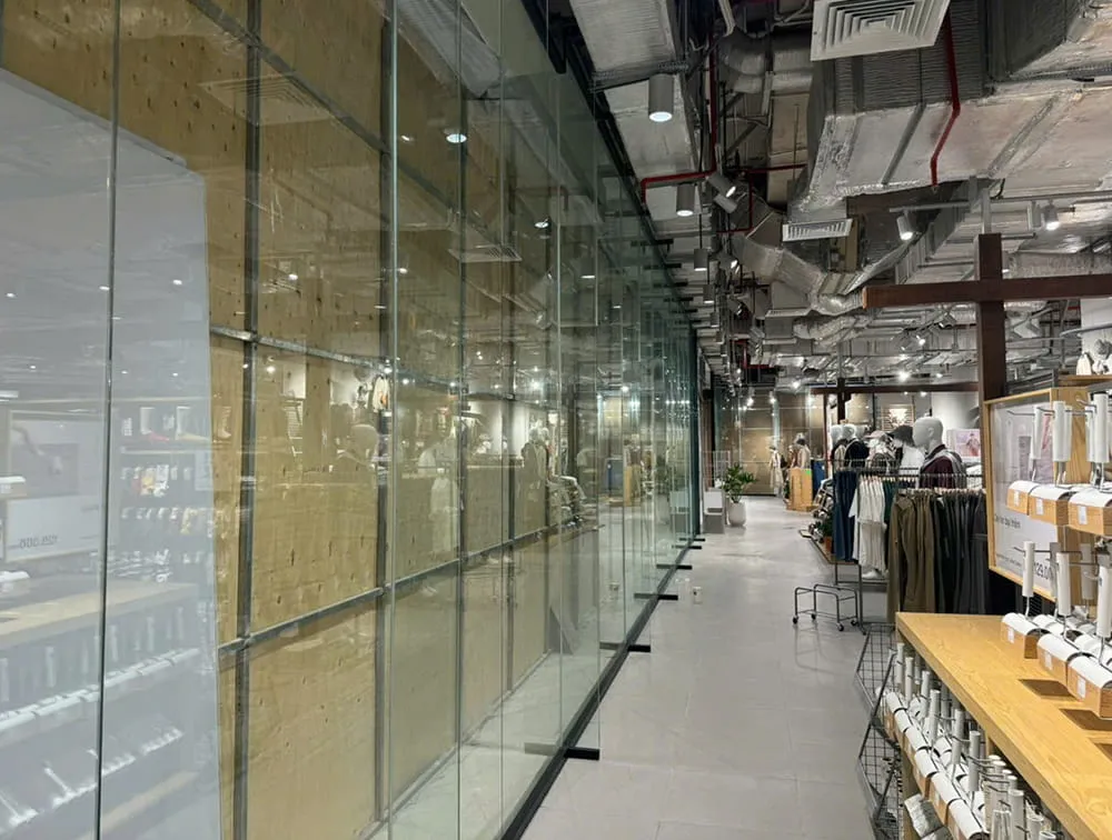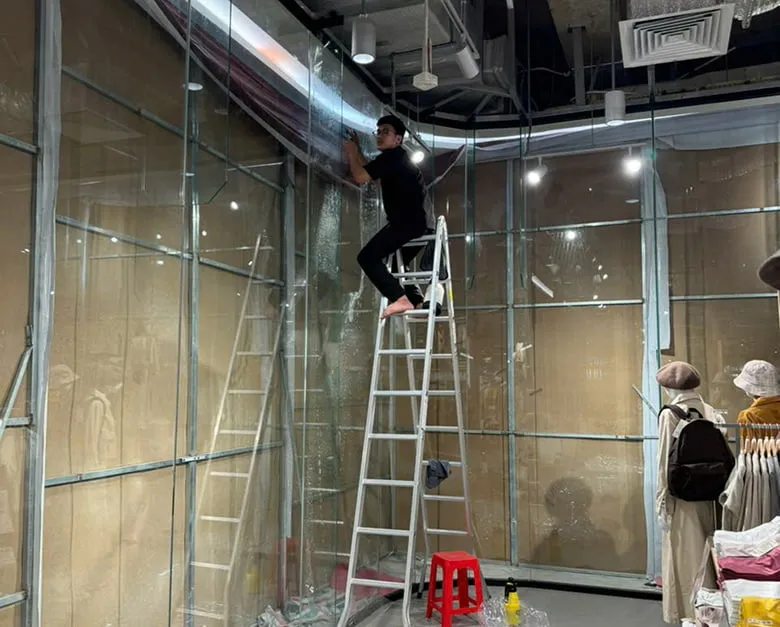 Đây là gian hàng mặt ngoài của tòa nhà, việc dán phim bảo vệ kính rất quan trọng, những tấm kính cứng cáp này sẽ trở thành rất yếu ớt trước gió bão. Sau khi dán phim dán kính an toàn giúp tăng độ kết dính và đàn hồi của kính, rủi ro về vỡ kính do gió giật hầu như không còn nữa.