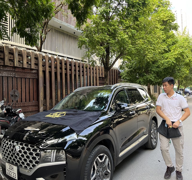 Chiếc xe Huyndai Santafe màu sơn đen, phía kính sườn sau và kính hậu có nhuộm màu tối, với đặc thù công việc đi công tác tỉnh rất nhiều, anh cần giảm chói sáng và chống nắng thật hiệu quả để trải nghiệm lái xe thoải mái nhất, chiếc xe đã được lựa chọn trang bị gói dán film ô tô cao cấp tại CNC Window Film.