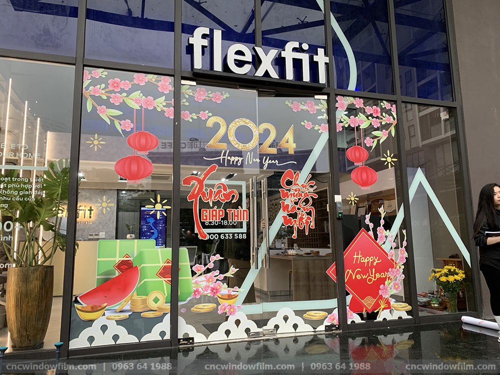 Mẫu tranh dán kính được thiết kế sống động, design theo khuôn cửa tạo nên một tổng thể hài hòa ấn tượng. Vào dịu đầu tháng 12 các kỹ thuật CNC đến dán trang trí về chủ đề Noel, chơi hết Noel ban quản lý bóc ra và dán mới chủ đề tết nguyên đán đón xuân Giáp Thìn.